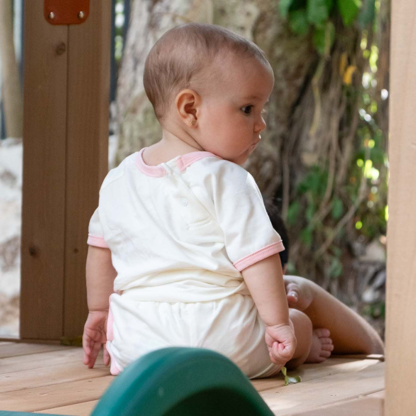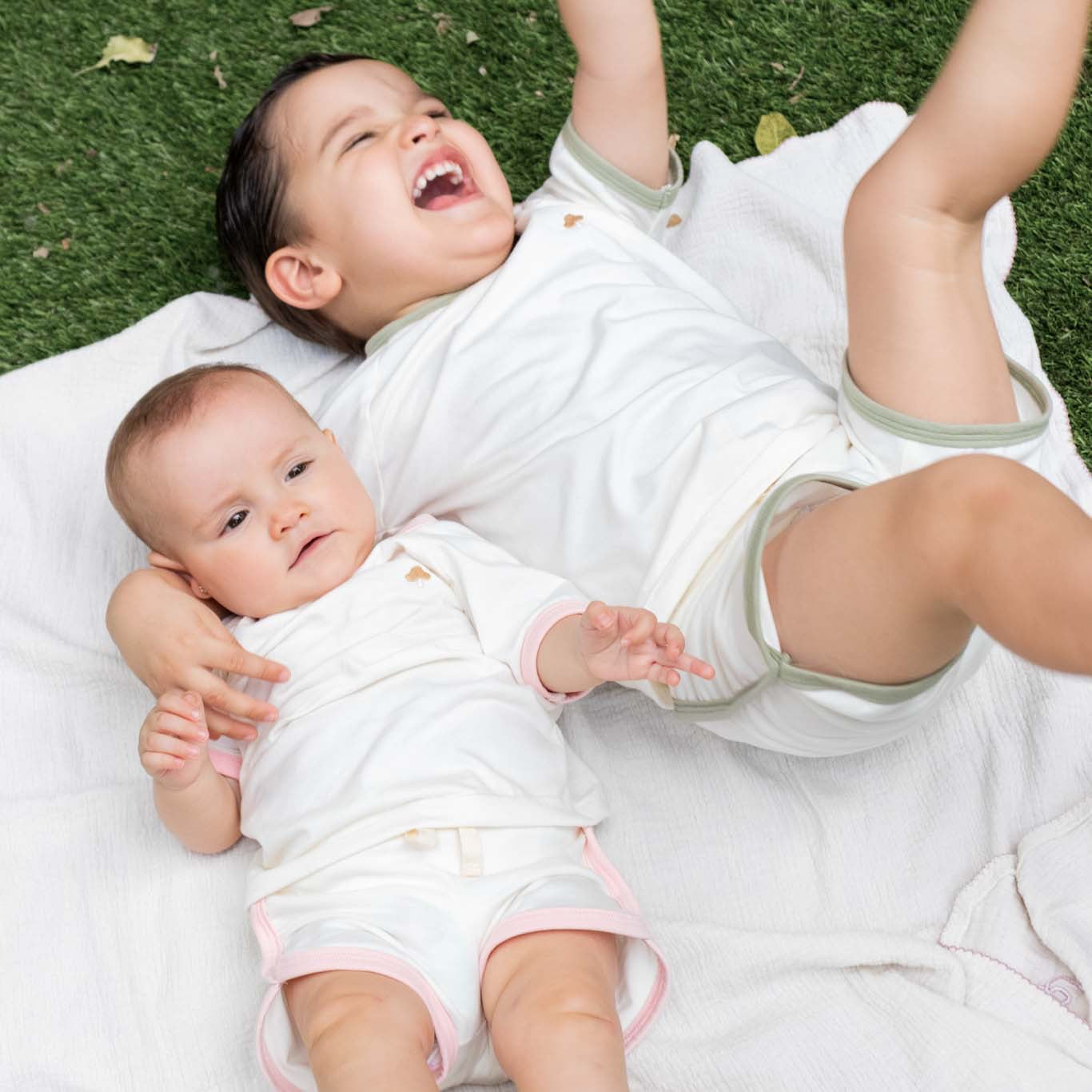 Este conjunto está hecho de una mezcla de algodón y elastano. Incluye una camiseta y un short, perfectos para que tu pequeño se sienta libre y cómodo en cada aventura. Además puedes hacer tu propia combinación, eligiendo el tono de bies (detalle de cuello y mangas), y el tono de las mangas.