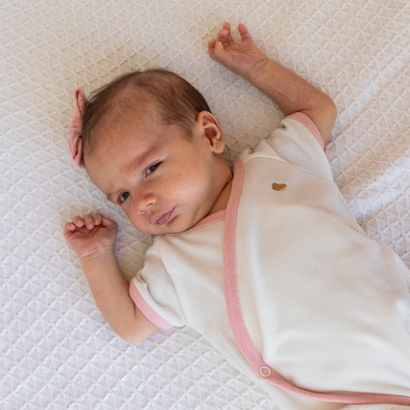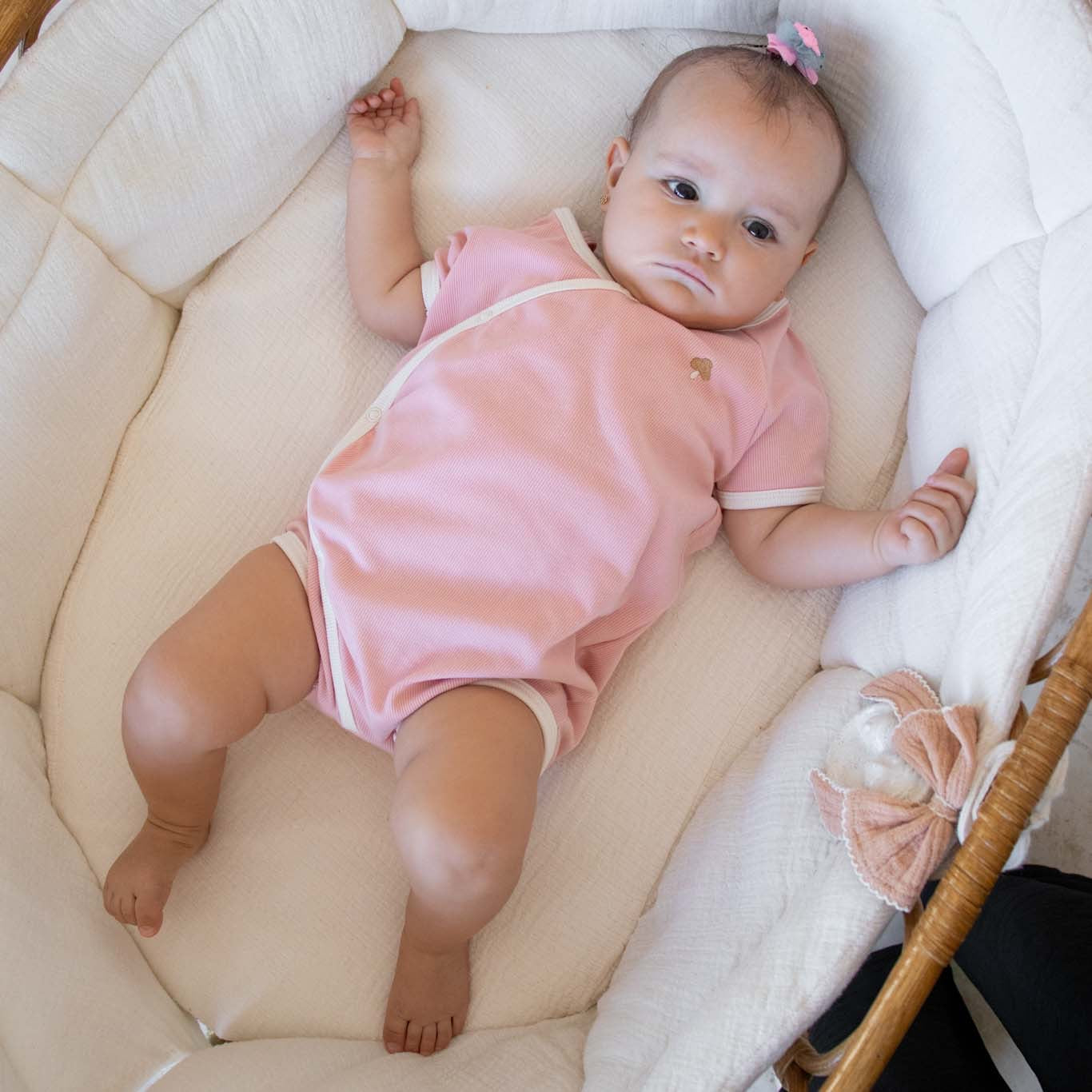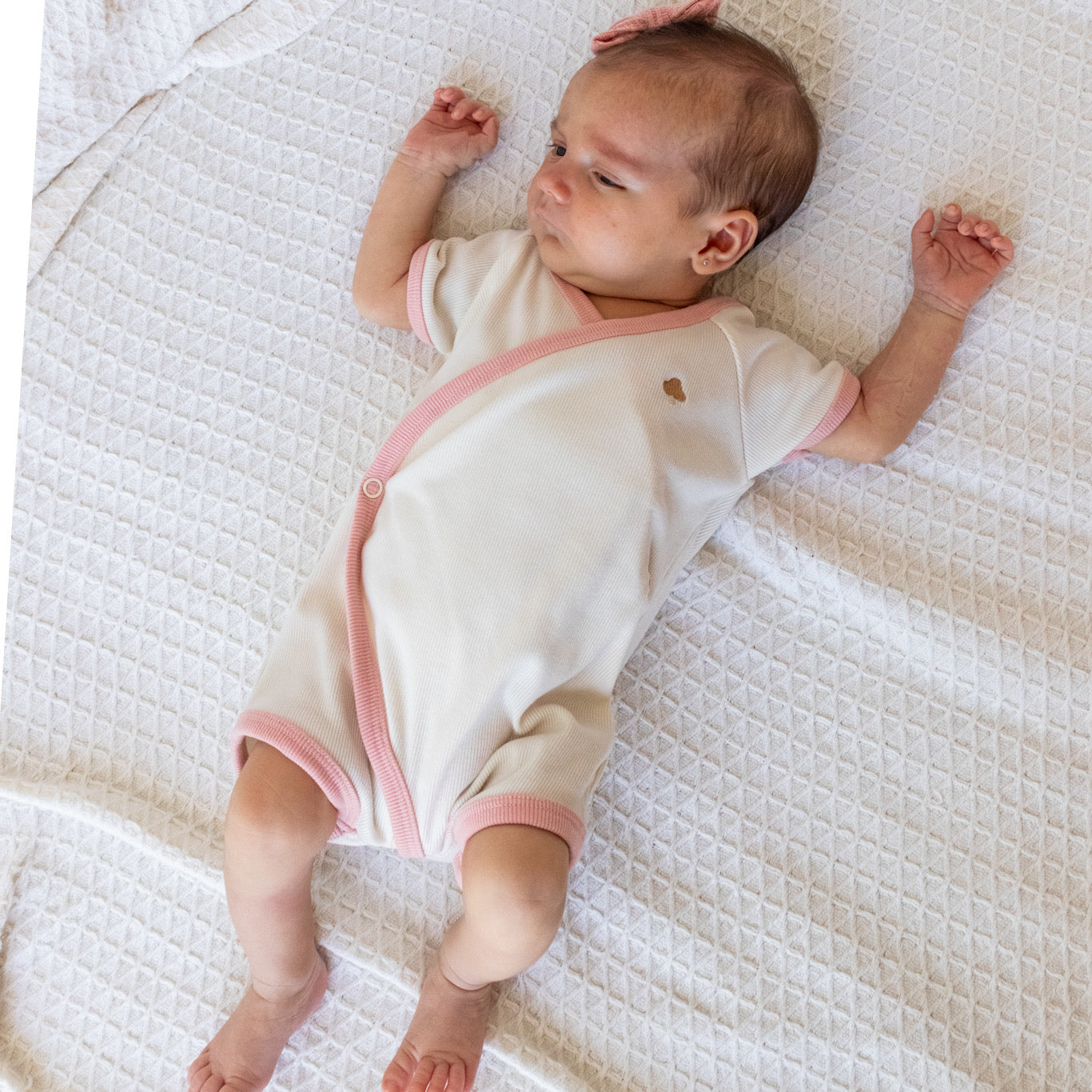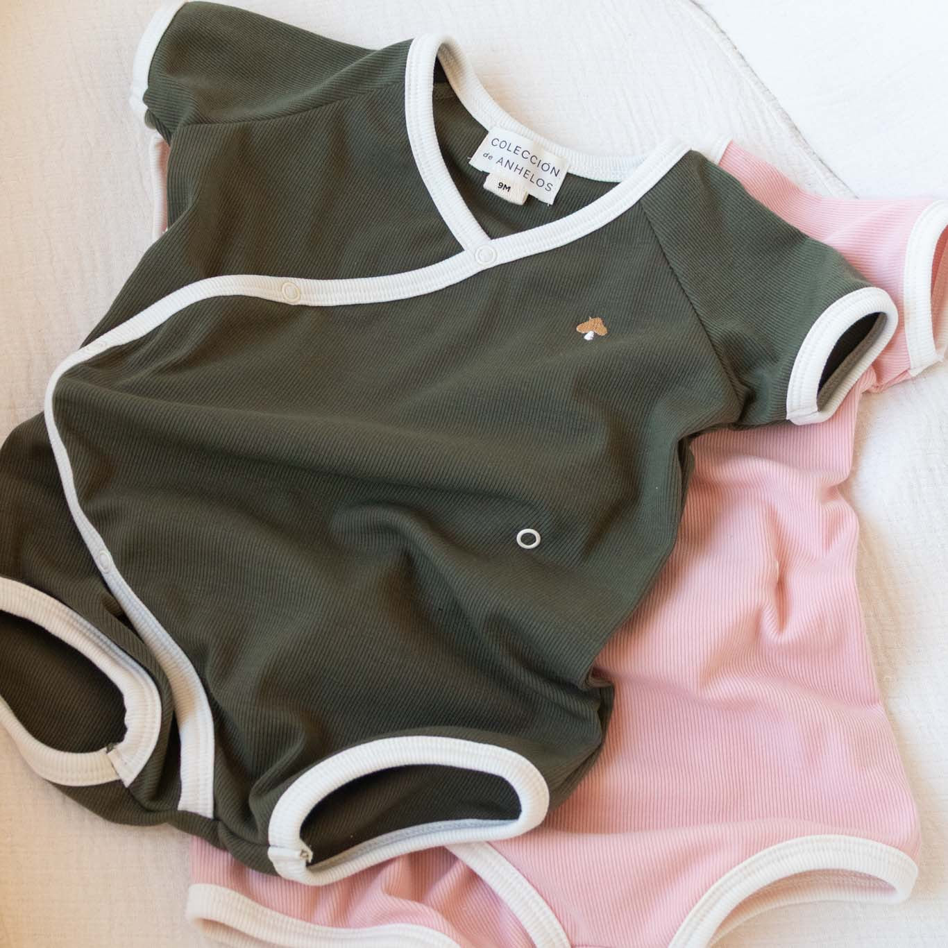 Este adorable enterizo para bebé combina comodidad y estilo con un diseño cruzado tipo kimono. Está disponible en tres colores de algodón acanalado. Puedes personalizar el look de tu bebé eligiendo el color de la orilla, creando una combinación única que refleje tu estilo.