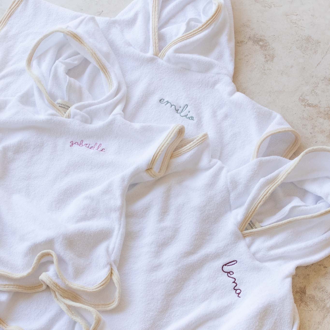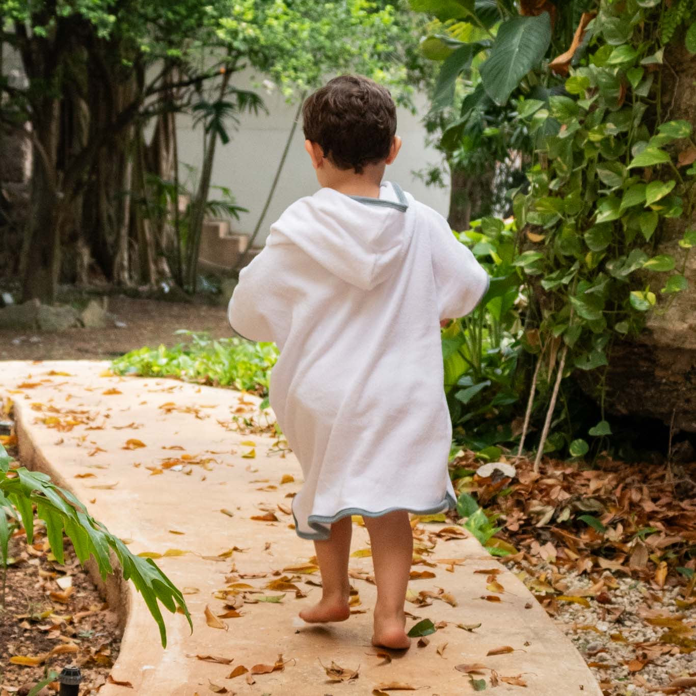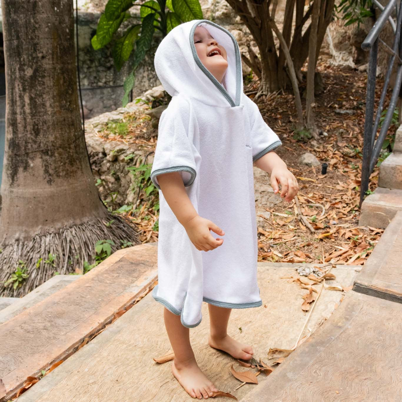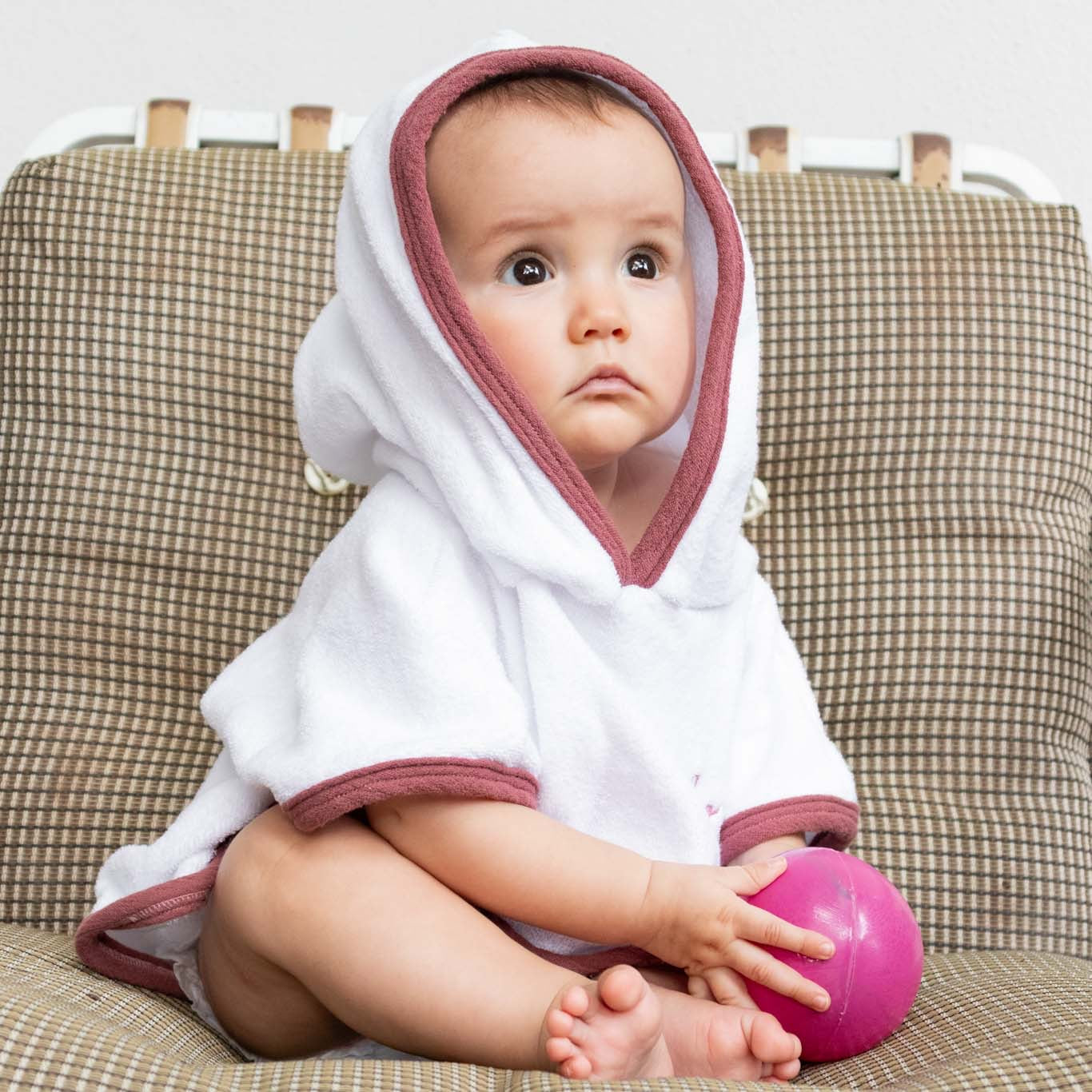 La salida de baño, hecha de 100% algodón, es ideal para ponérsela al bebé después del baño, playa o alberca. La prenda es de tela blanca, pero el color del bies está disponibles en nuestros 7 colores de muselina.