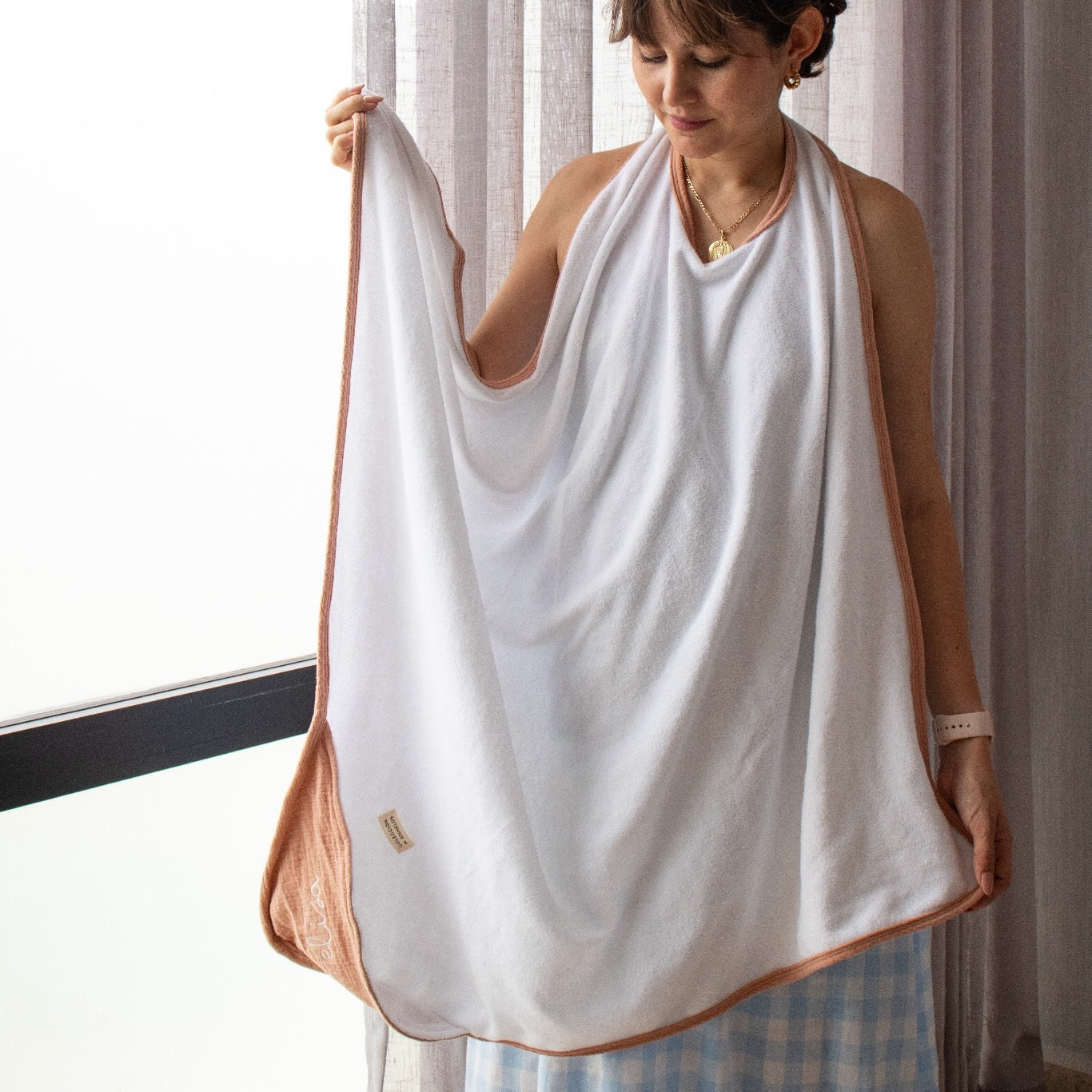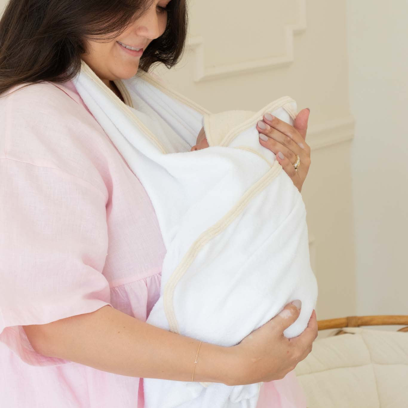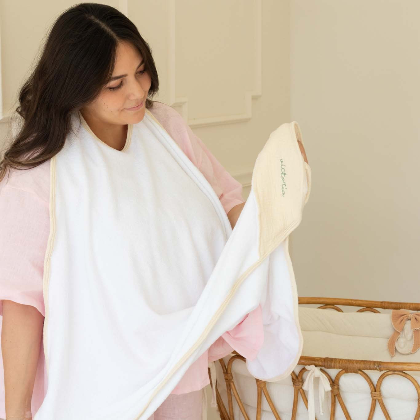Bañar a tu bebé será más sencillo y cómodo. Con su textil suave de algodón, esta toalla es ideal para envolverlo de manera suave y delicada, gracias a la abertura que tiene para colocarse en el cuello de quien lo baña. Además, puedes personalizarla eligiendo el color de la capucha y del nombre bordado. Una excelente opción para tu recién nacido.